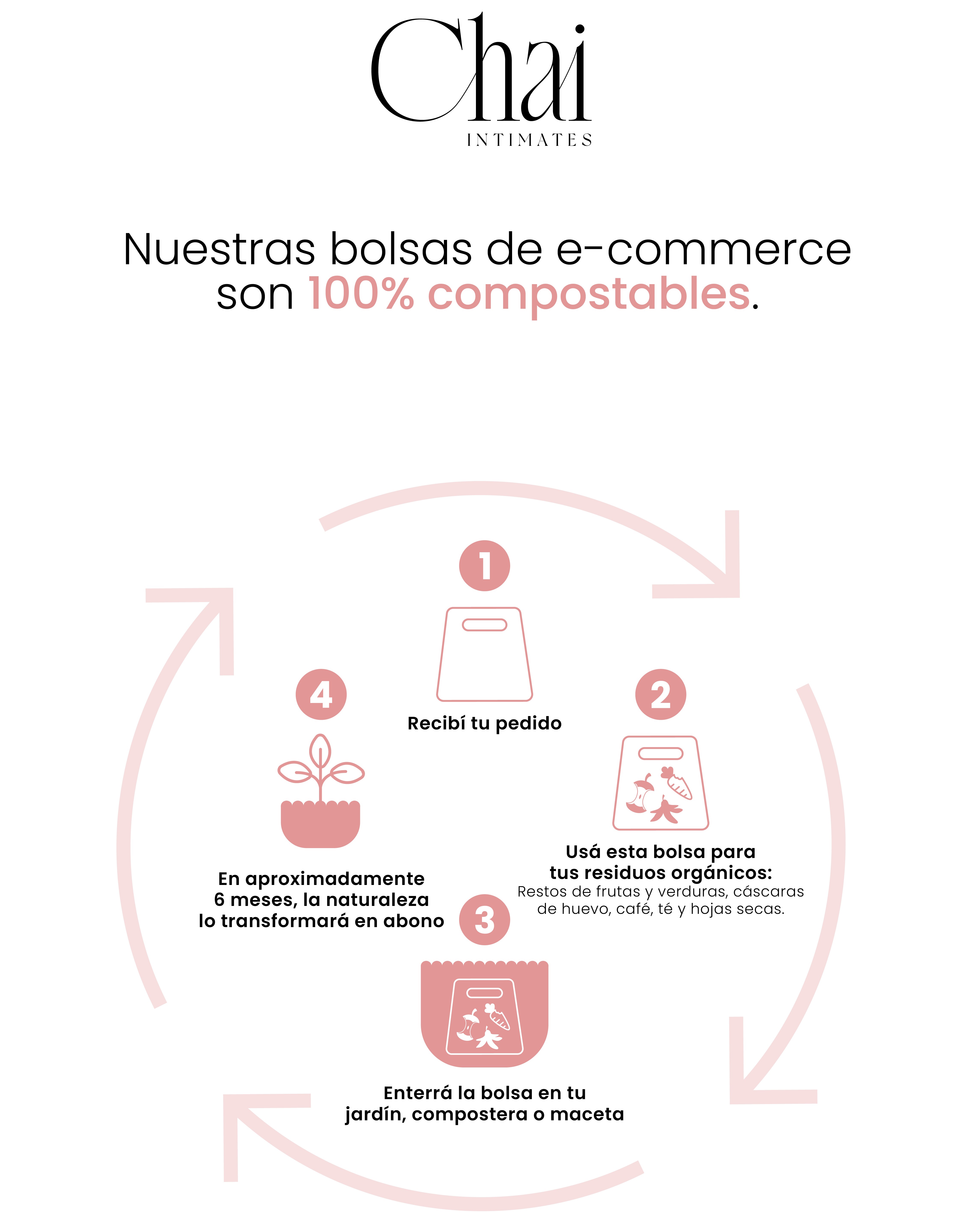 Nuestras bolsas para envíos son 100% compostables.Abrila, usala y compostala.